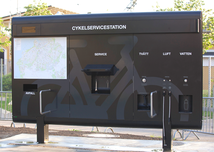 Till kunskapsbankenFör några veckor sedan invigde vi Malmös första servicestation där cyklister kan pumpa och tvätta sin cykel, fylla på vattenflaskan och utföra enklare reparationer. Cykeln går enkelt att hänga upp på en hållare för att underlätta vid exempelvis lagning av punktering eller annan enkel cykelreparation.