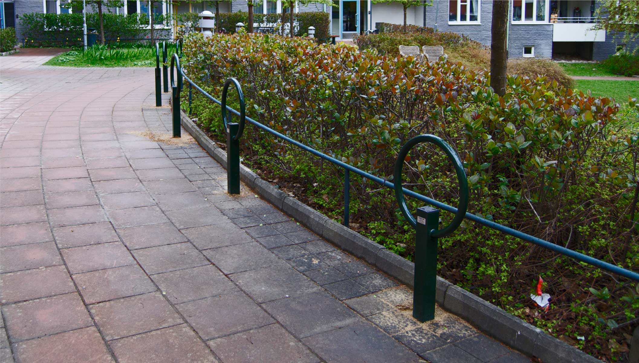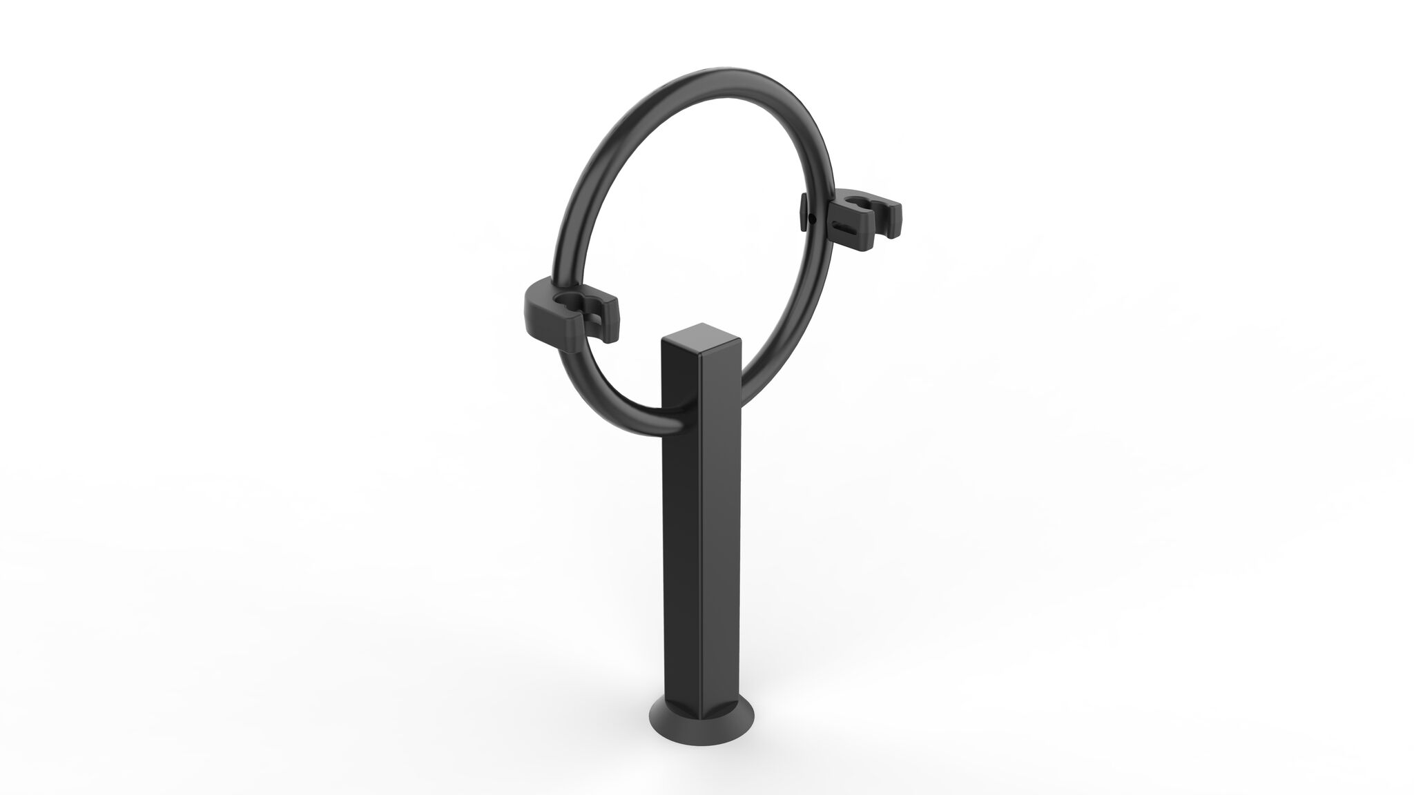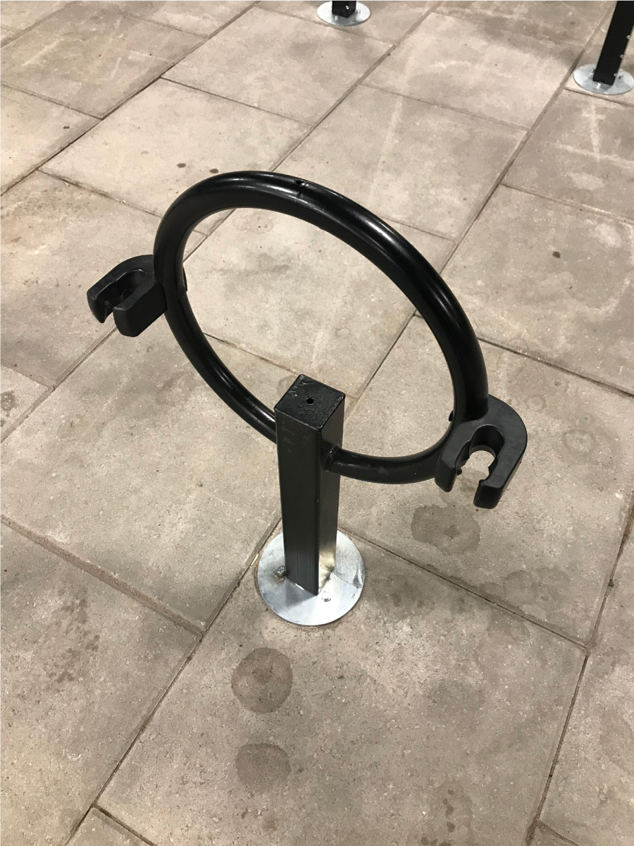 Polkupyörän voi laittaa joko nojaamaan teräsrenkaaseen tai vaihtoehtoisesti kiinnittää renkaassa olevaan kumipidikkeeseen.