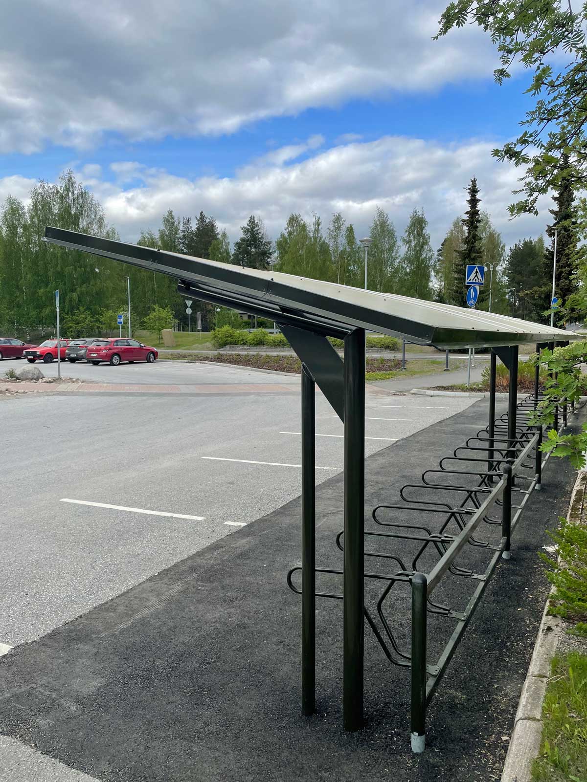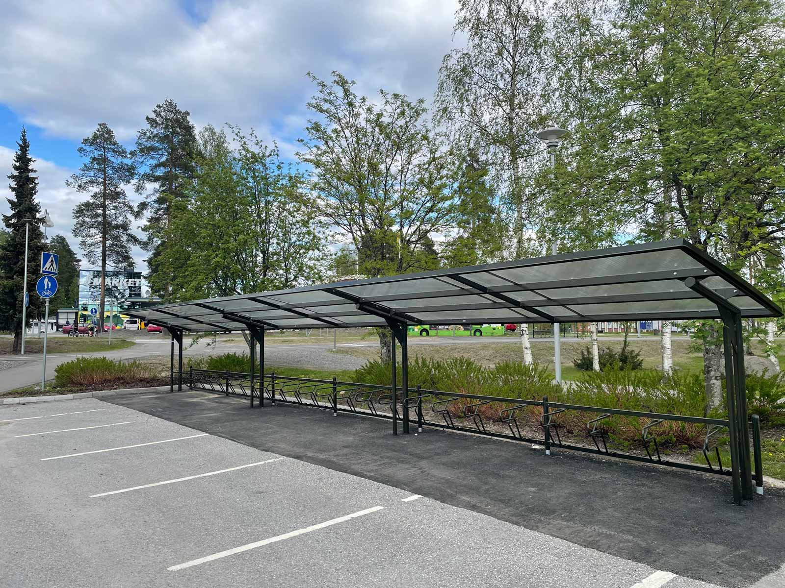 Pyöräkatos tuntuu turvalliselta LED-valaistuksen ja avoimien seinien ansiosta. Itse pyöräkatos on 2,1m syvä, jotta se suojaa polkupyörän myös vesisateelta.