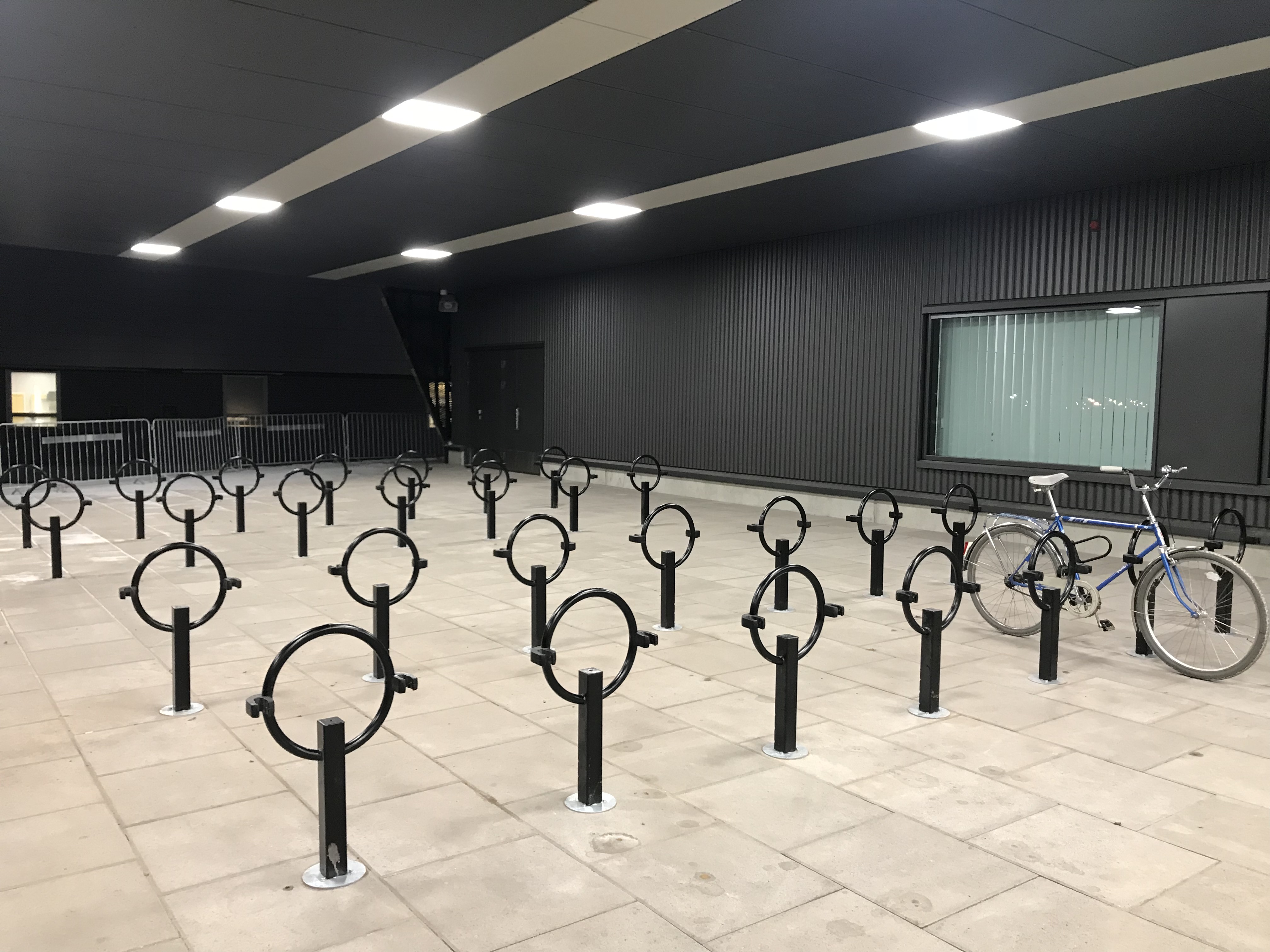 OMEGA telineet sijaitsevat sisääntulon vieressä, urakoitsija on asentanut telineet hienosti ja suoriin riveihin, mikä helpottaa polkupyöräilijöitä.