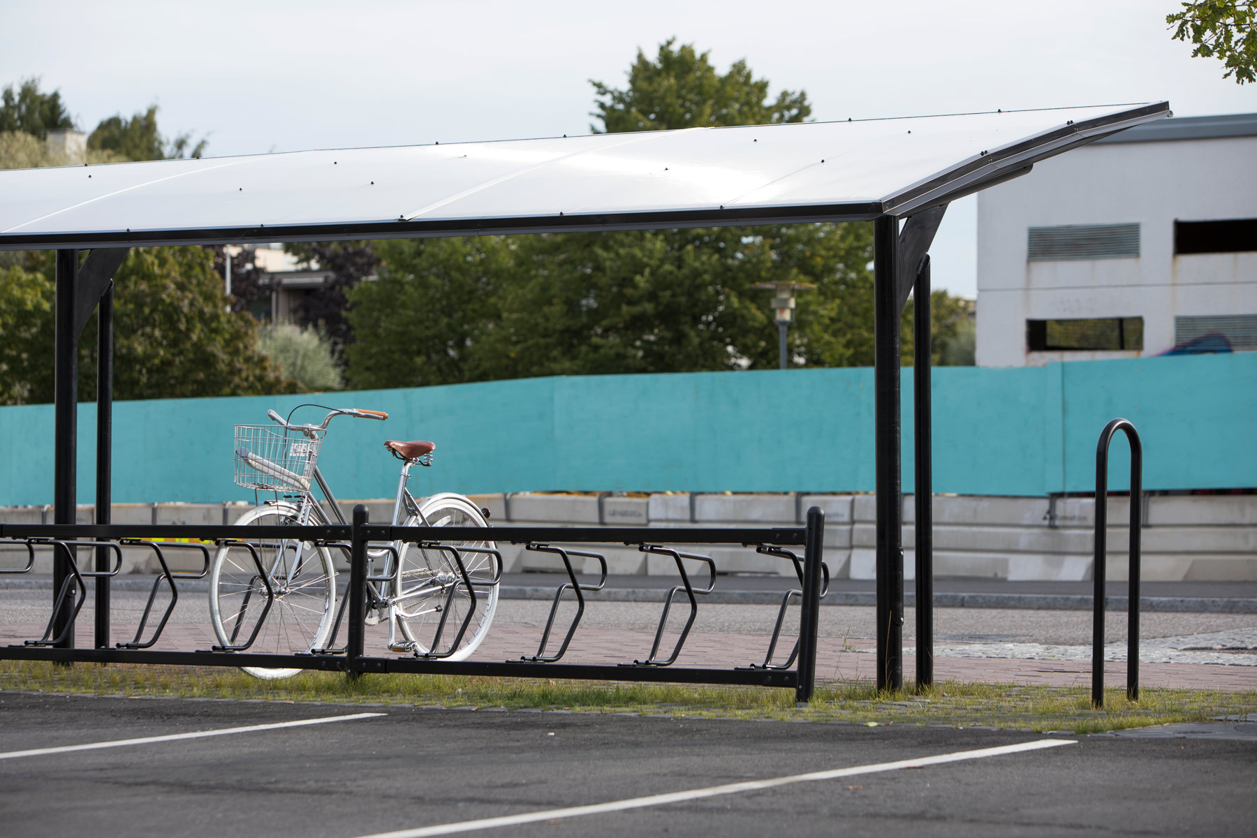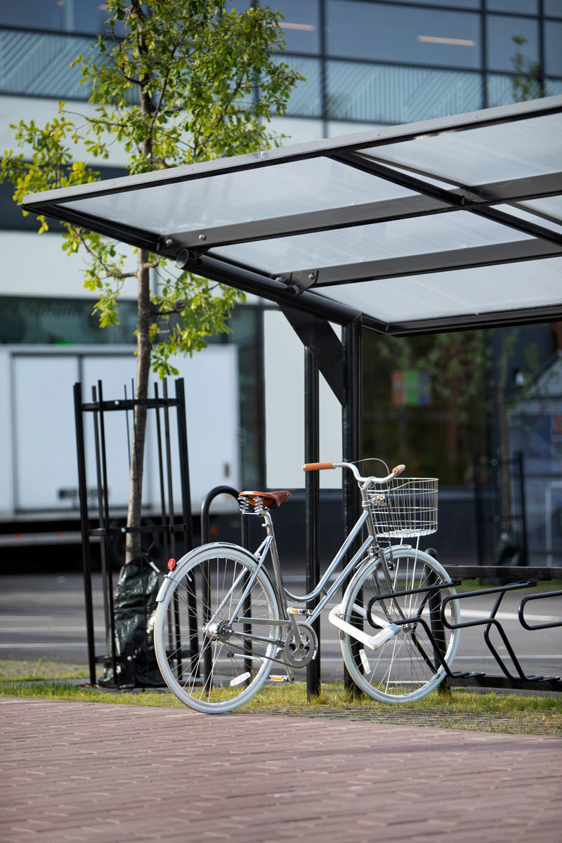 Ett cykeltak med en stabil och beprövad konstruktion, väl utprovad funktions- och kvalitetsmässigt samt designad för att smälta in i många olika miljöer. Transparent och UV-beständig kanalplast som ger cyklarna ett ordentligt skydd mot regn och snö. Ett bra tak för cyklarna utan att hindra cyklisternas framkomlighet i och med dess luftiga konstruktion utan ytterstolpe.