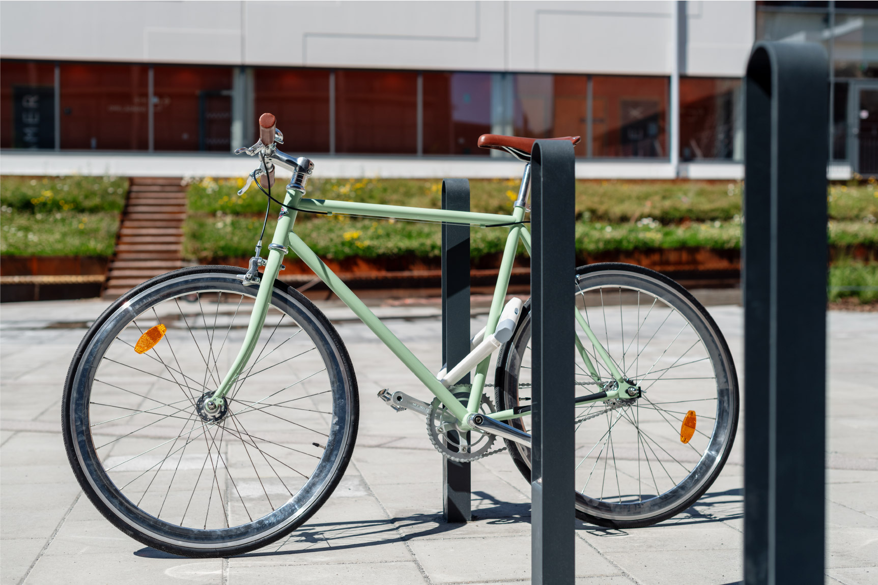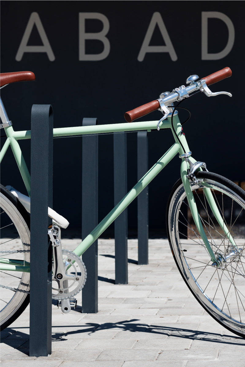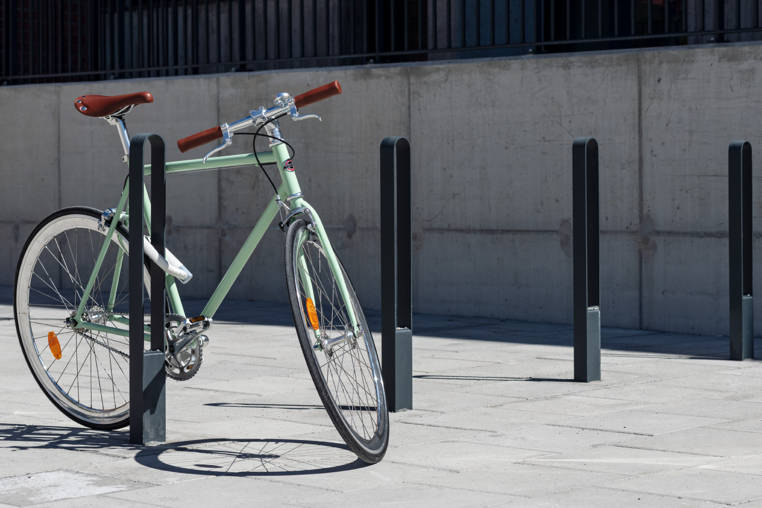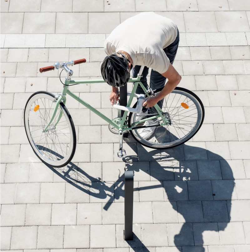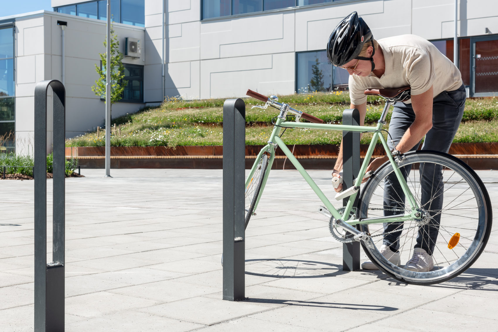 Cykelpollare med plats för två cyklar. Kan även användas som ”vanlig” pollare. Ett diskret formspråk med möjlighet för fastlåsning av cyklarna.