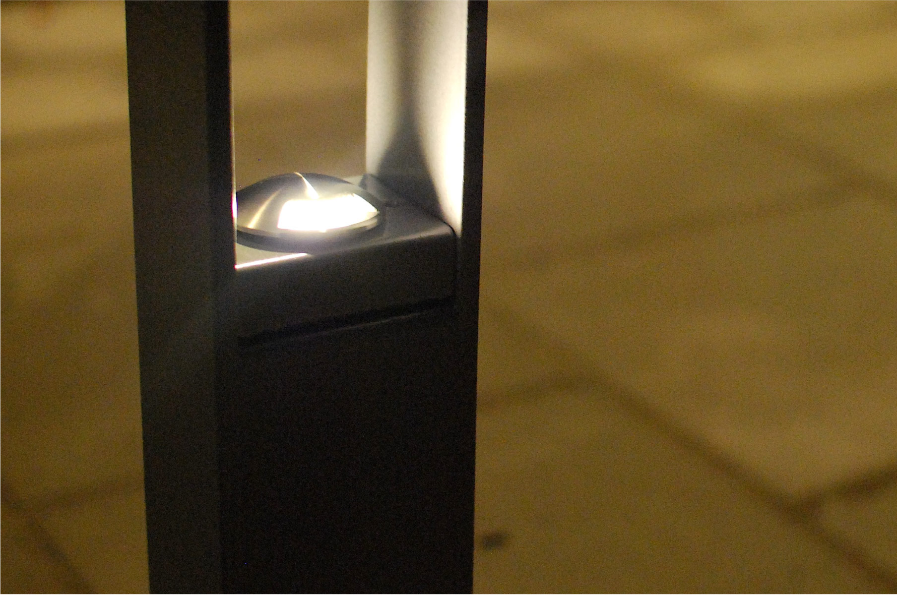 Integrerad och utbytbar LED-belysning som skapar ett sken runt pollaren. Ljus för design, trygghet och säkerhet. LED-belysning IP65, 1,2W, 350mA, 37V.
