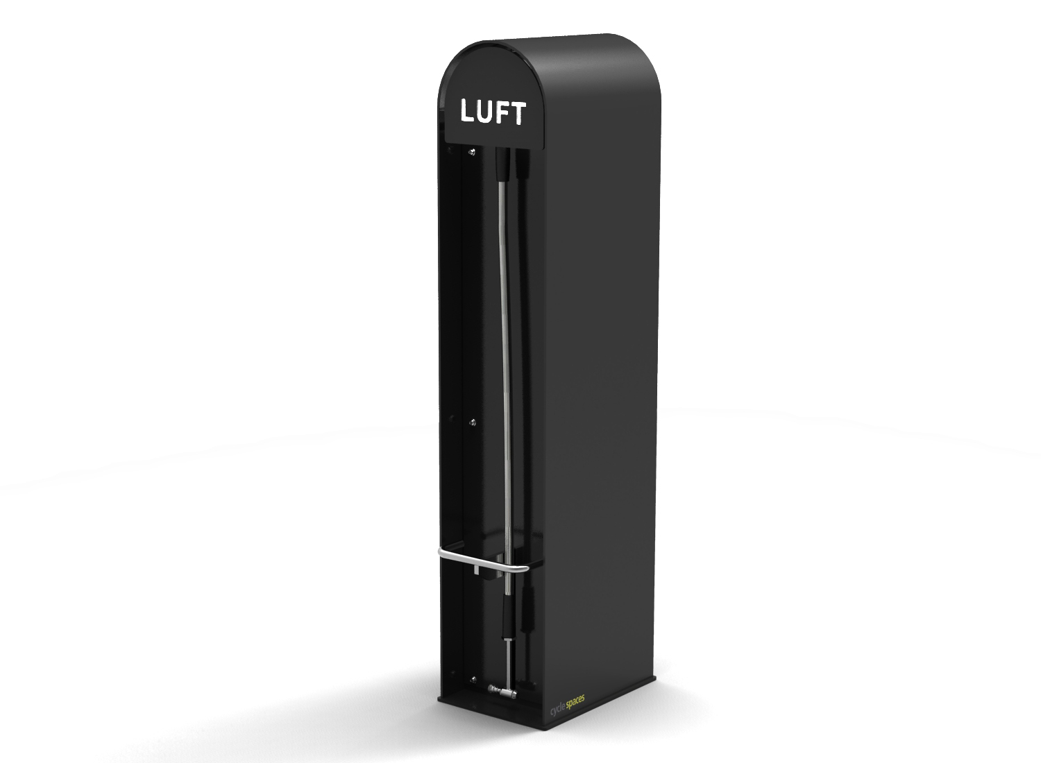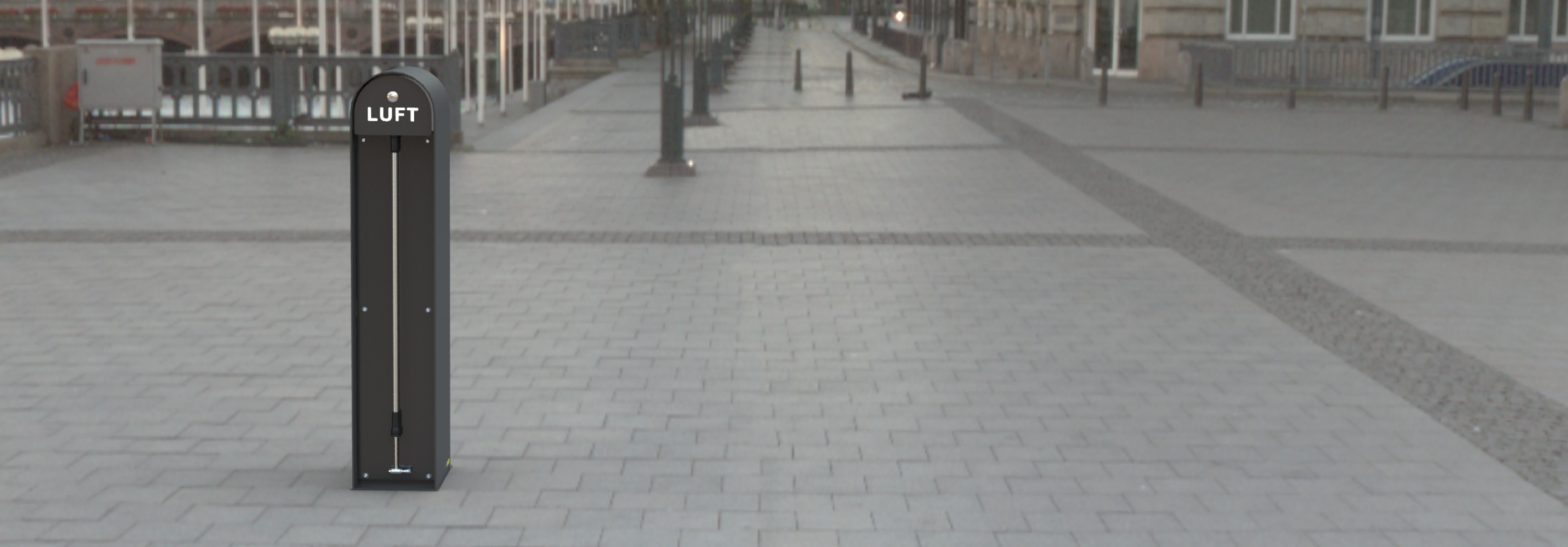 Offentlig cykelpump med modern design med fokus på driftsäkerhet och elegans. Konstruerad för att tåla den tuffa offentliga utemiljön.
